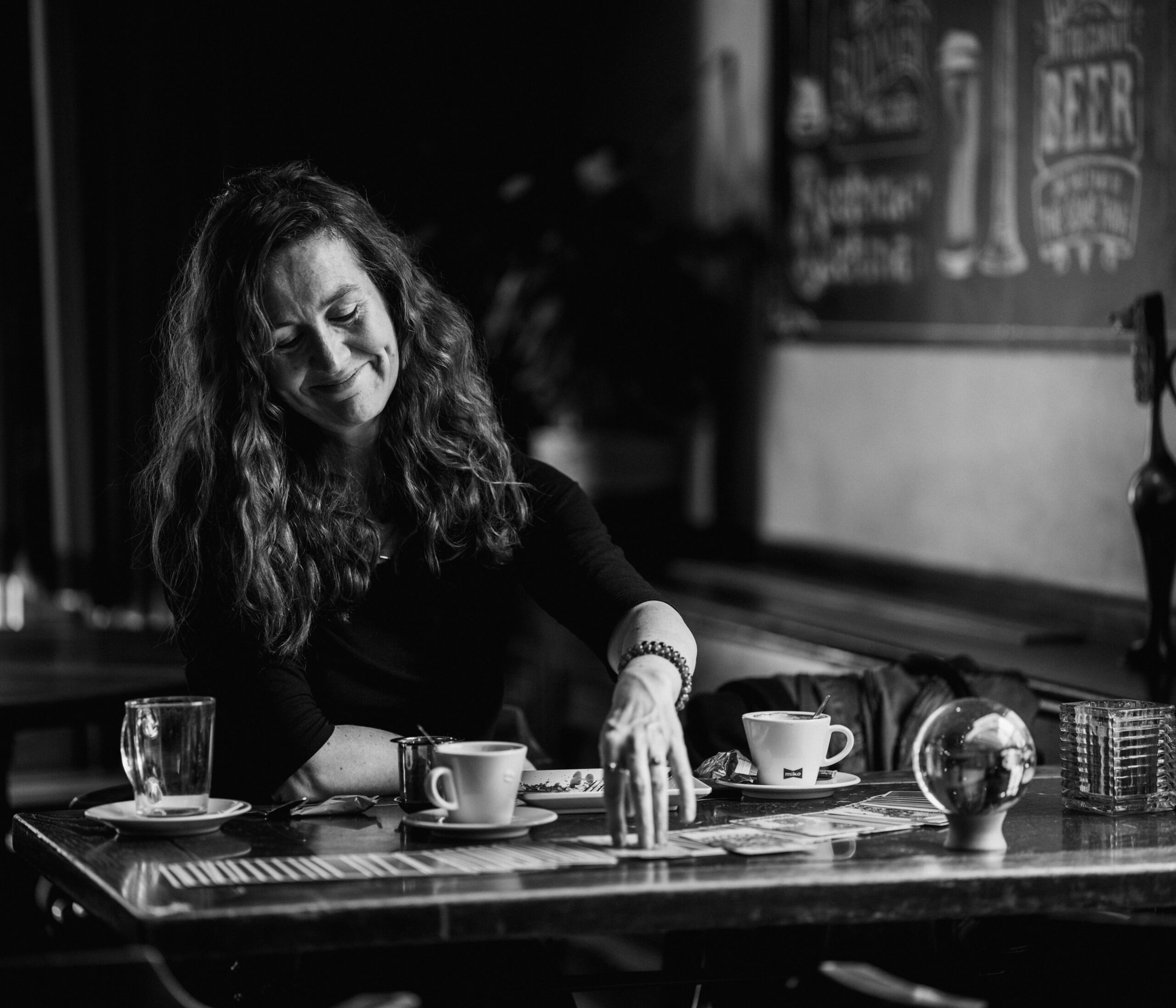 ‘Het is gewoon,’ ik zocht woorden ‘ze zijn al zolang bij me en ze nodigen uit tot zoveel leuke gesprekken. Met mezelf, maar ook met anderen. Jaren geleden zat ik ergens te werken en toen kwam er een gezin mijn waarzegster-tentje binnen. Vader, moeder, twee dochters. De vader ging zitten, moeder en kinderen schaarden zich achter hem. Hij koos kaarten en ik begon te interpreteren en bij alles wat ik zei keek hij verbaasd of schudde soms zelfs nee. Maar zijn vrouw en dochters achter hem knikten overduidelijk ja, het was hilarisch! Het werd een prachtig gesprek over hoe liefdevol en aanwezig hij wèl was, in hun ogen. Hoe creatief hij wel was, want kijk nou naar het laminaat in de gang bij dat gekke stukje bij de trap. Zij hadden daar vol verbazing naar gekeken, naar hoe hij dat voor elkaar had gekregen. Klik klik klik.